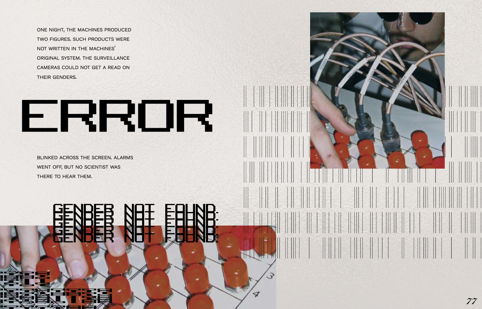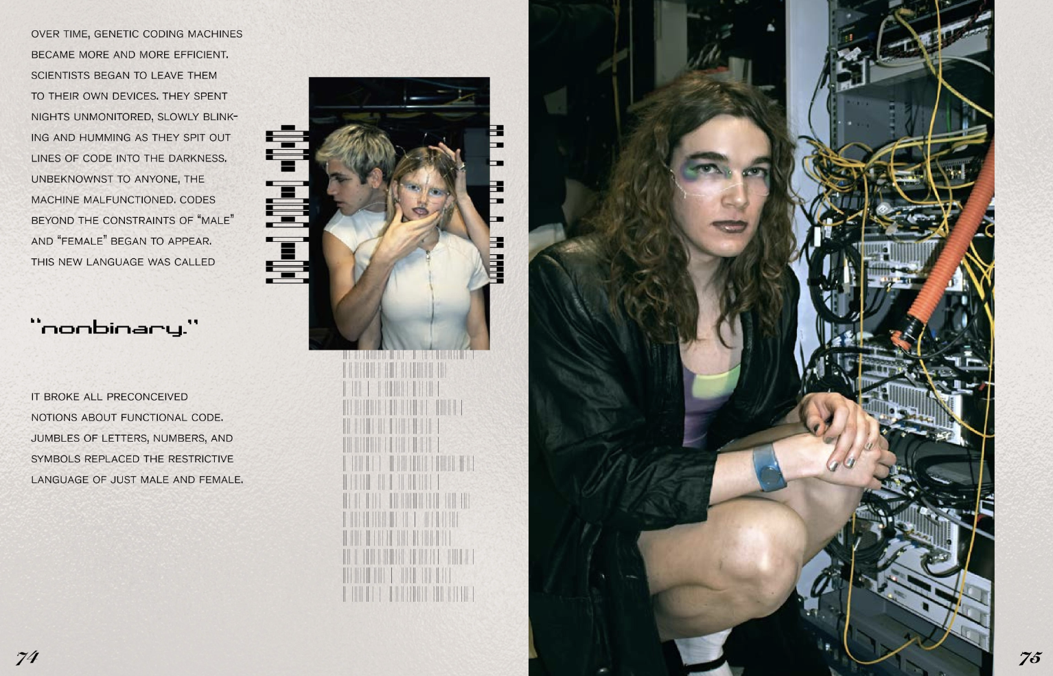 This editorial explores the collapse of binary constructs—gender and code—through a dystopian lens. In a world meticulously programmed into Male + Female, an accidental glitch in the system births a new reality: the genderless. With ethereal appearances and haunting determination, these beings challenge societal norms, disrupting the confines of the binary and reclaiming autonomy.