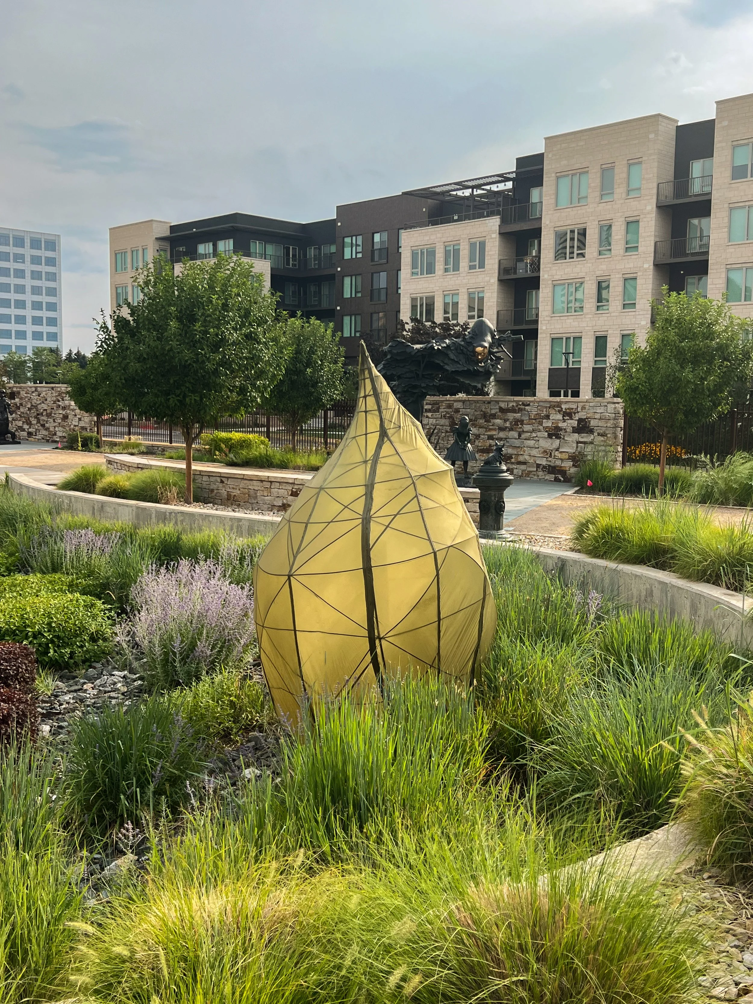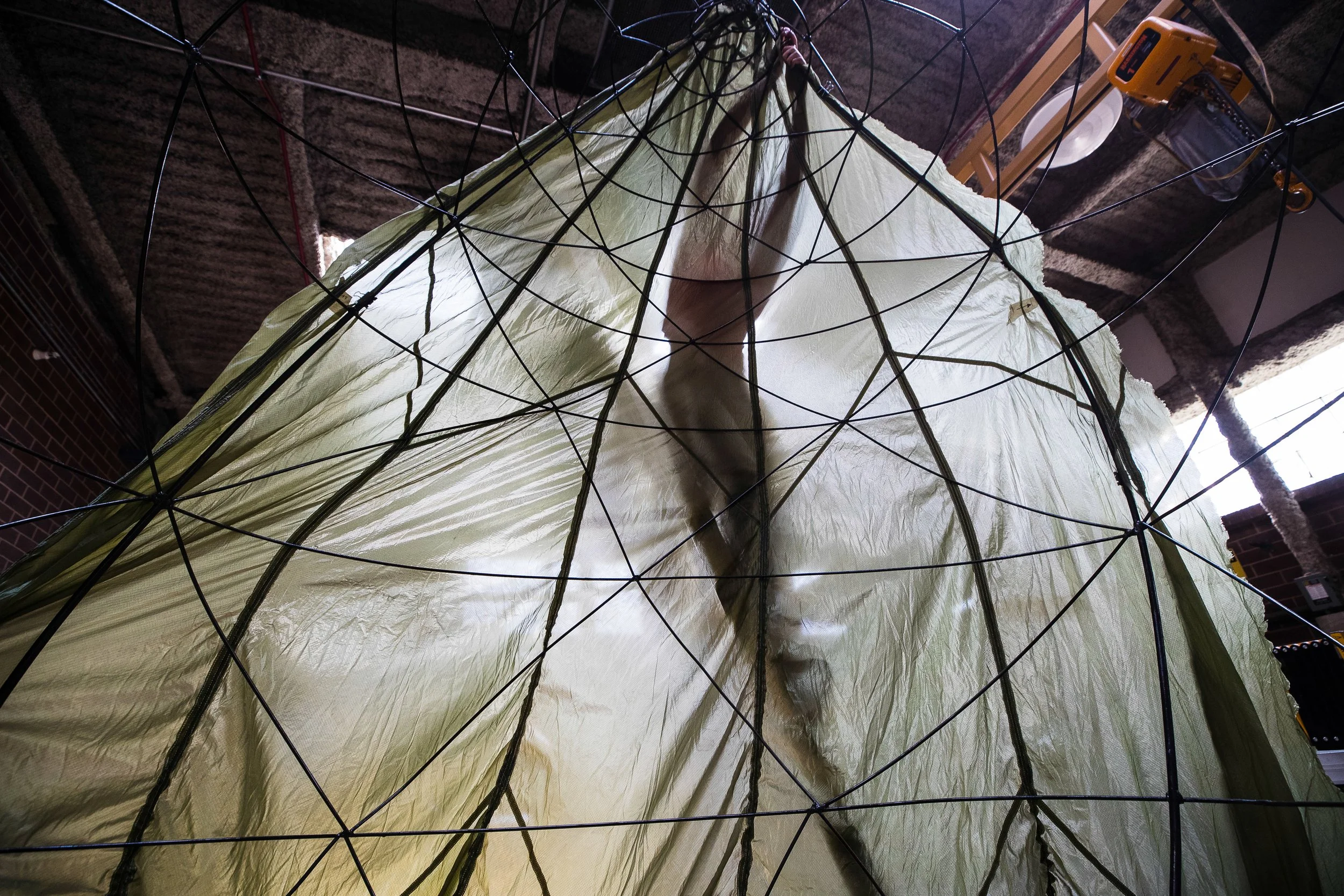 Chrysalis is a large-scale sculptural form built from a welded armature inspired by the tetrahedron—the Platonic solid associated with fire and rebirth. Its shape evokes a cocoon mid-metamorphosis, stretched with translucent fabric and lit from within, casting warm fire-like light through the geometric skeleton. Though rooted in sacred geometry, the structure resists symmetry, leaning into the organic asymmetry of nature. It glows from within like a being on the cusp of becoming.